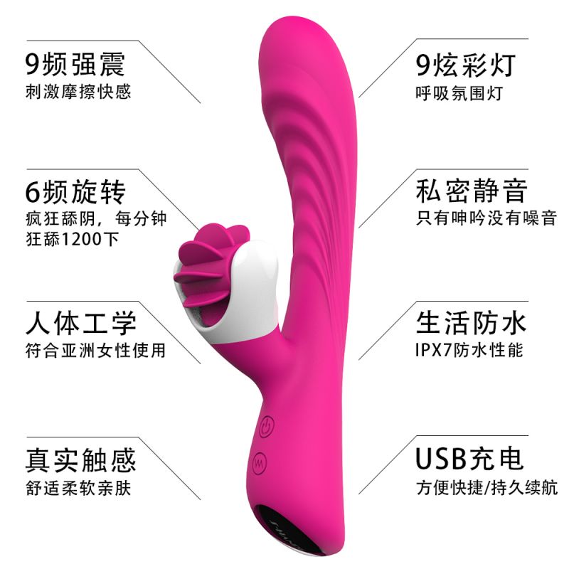产品优点:外舔内震、9频震动模式、6种旋转模式、持久续航、疯狂舌舔、静音防水柔软亲肤、棒身纹理、摩擦更爽、棒身收腰设计,不会撑大私处、人体工学设计,贴合女性阴道曲线